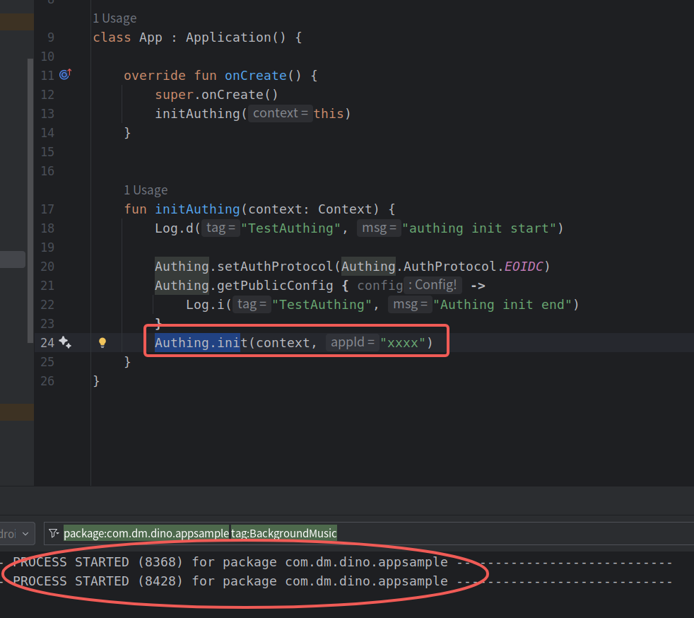 在相同的设备上,如果不调用红色框中 init 方法,则只看到一次进程启动,如果调用了就会看到两次进程启动,如下图所示。